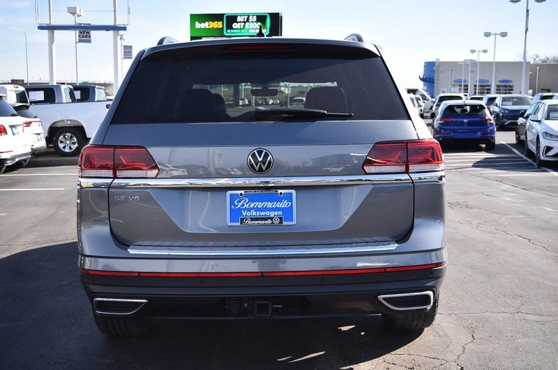 CARFAX One-Owner. Clean CARFAX. Certified. Platinum Gray Metallic 2023 Volkswagen Atlas 3.6L V6 SE w/Technology FWD 8-Speed Automatic with Tiptronic 3.6L VR6 Volkswagen Certified Pre-Owned Certified, 2nd-Row Dual Captain's Chairs, 3.60 Axle Ratio, 3rd row seats: split-bench, 4-Wheel Disc Brakes, 6 Speakers, ABS brakes, Air Conditioning, Alloy wheels, AM/FM radio: SiriusXM with 360L, Auto-Dimming Rear-View Mirror, Auto-dimming Rear-View mirror, Automatic temperature control, Brake assist, Bumpers: body-color, Compass, Delay-off headlights, Driver door bin, Driver vanity mirror, Dual front impact airbags, Dual front side impact airbags, Electronic Stability Control, Emergency communication system: VW Car-Net Safe & Secure 5-year, Exterior Parking Camera Rear, First Aid Kit, Four wheel independent suspension, Front anti-roll bar, Front Bucket Seats, Front Center Armrest, Front dual zone A/C, Front fog lights, Front reading lights, Fully automatic headlights, Heated Comfort Front Bucket Seats, Heated door mirrors, Heated front seats, Heavy Duty Trunk Liner w/VW CarGo Blocks, Illuminated entry, Leather Shift Knob, Low tire pressure warning, Occupant sensing airbag, Outside temperature display, Overhead airbag, Overhead console, Panic alarm, Panoramic Sunroof Package, Passenger door bin, Passenger vanity mirror, Perforated V-Tex Leatherette Seating Surfaces, Power door mirrors, Power driver seat, Power Liftgate, Power steering, Power Tilting & Sliding Panoramic Sunroof, Power windows, Privacy Cover, Radio data system, Radio: MIB3 Composition Media w/8" Touchscreen, Rain sensing wipers, Rear air conditioning, Rear anti-roll bar, Rear reading lights, Rear seat center armrest, Rear window defroster, Rear window wiper, Remote keyless entry, Roadside Assistance Kit, Rubber Mats Kit - Captain's Chairs, Security system, Speed control, Speed-sensing steering, Split folding rear seat, Spoiler, Standard Suspension, Steering wheel mounted audio controls, Tachometer, Telescoping steering wheel, Tilt steering wheel, Traction control, Trip computer, Turn signal indicator mirrors, Variably intermittent wipers, VW Care, Wheels: 20" x 8J 5-Spoke Silver Painted Alloy.