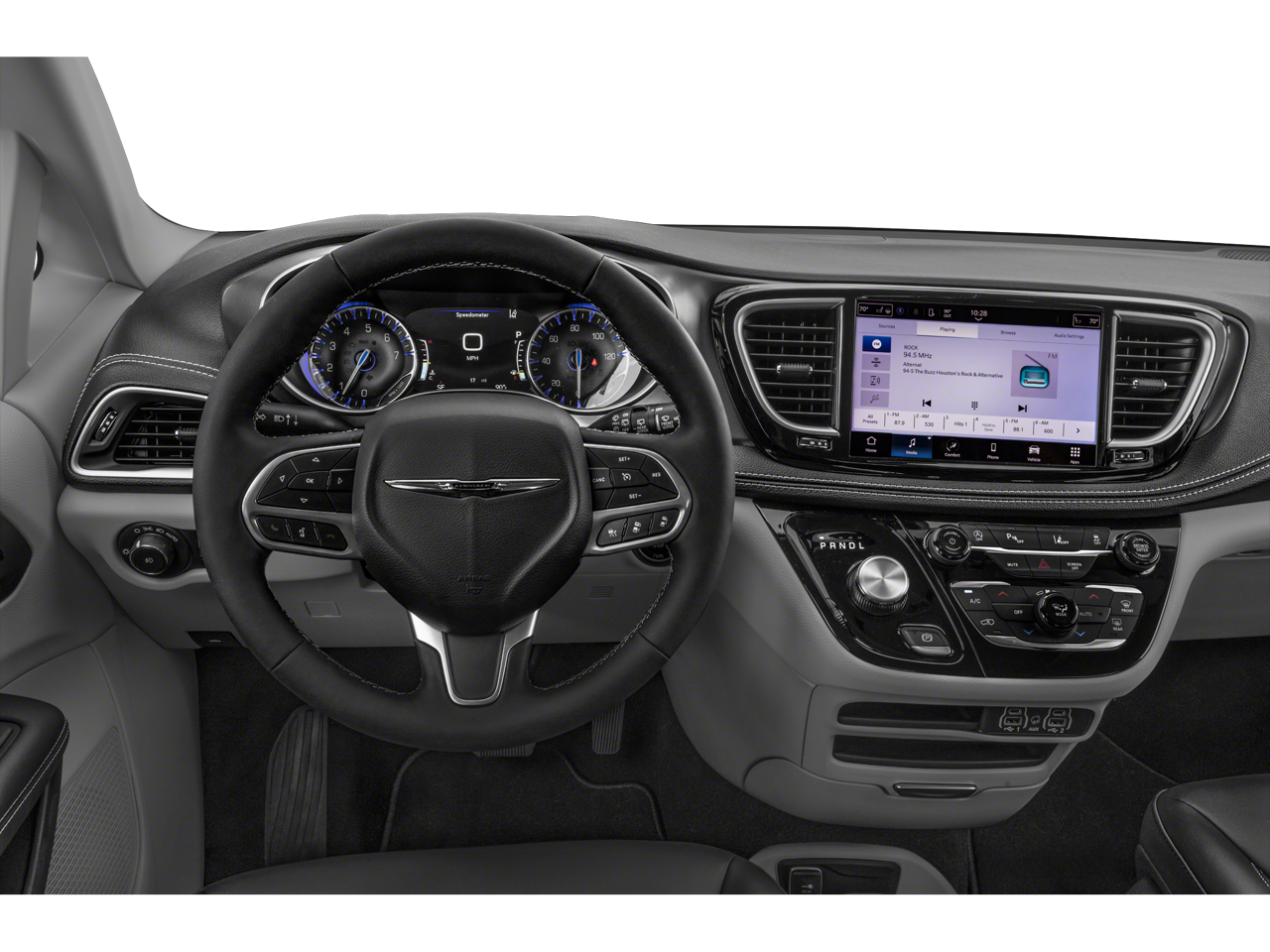 Step inside and be captivated by the Pacifica's wealth of premium features. The Caprice Leatherette Bucket Seats provide exceptional comfort, while the heated steering wheel and heated front seats ensure you and your passengers stay cozy in any weather. The 10.1" Touchscreen Display with Apple CarPlay and Google Android Auto integration keeps you seamlessly connected, while the Integrated Active Noise Cancellation technology ensures a peaceful, distraction-free ride.